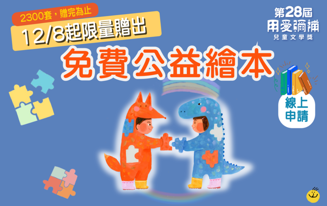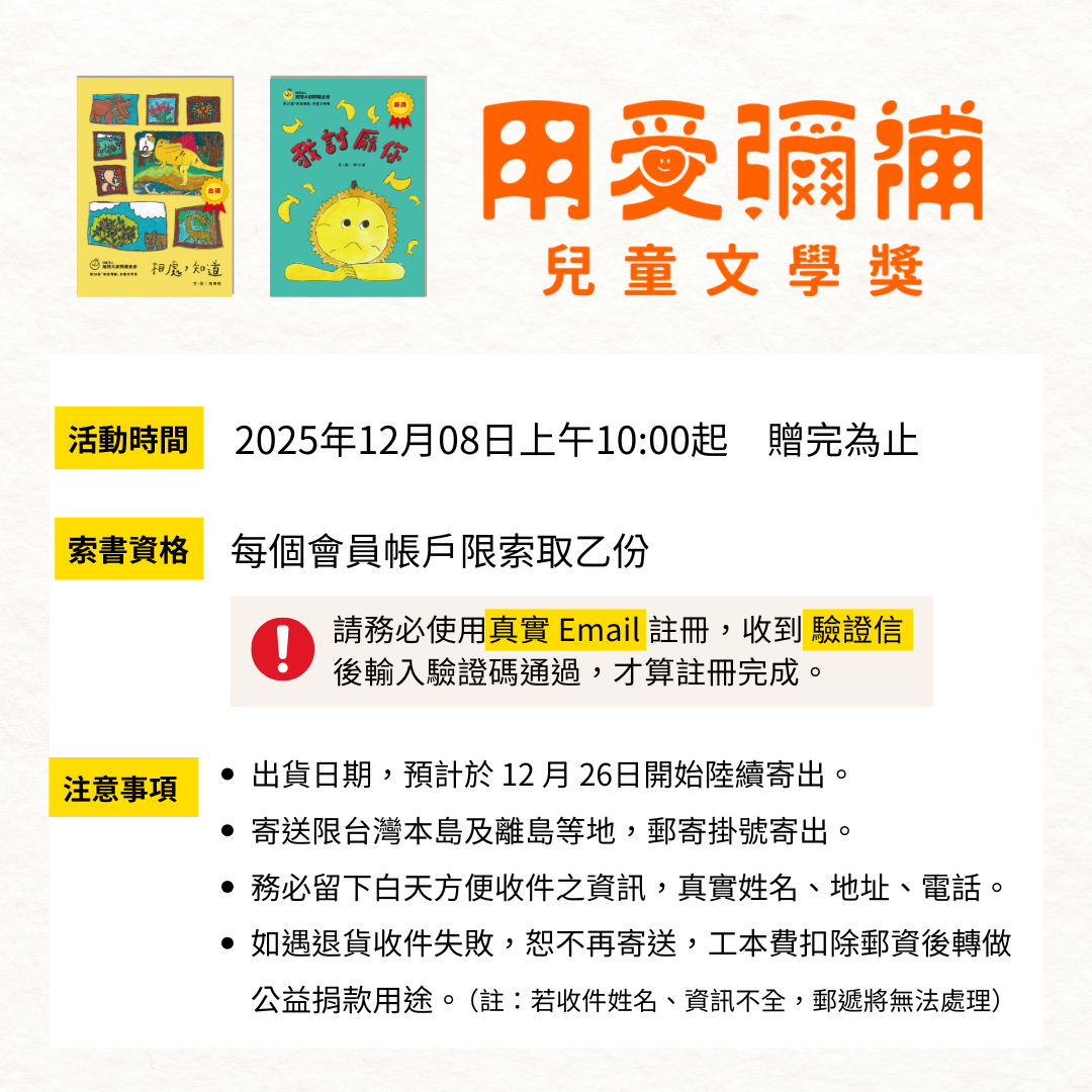 本次活動將免費贈出「第28屆用愛彌補兒童文學獎」金獎《相處,知道》、銀獎《我討厭你》各1本