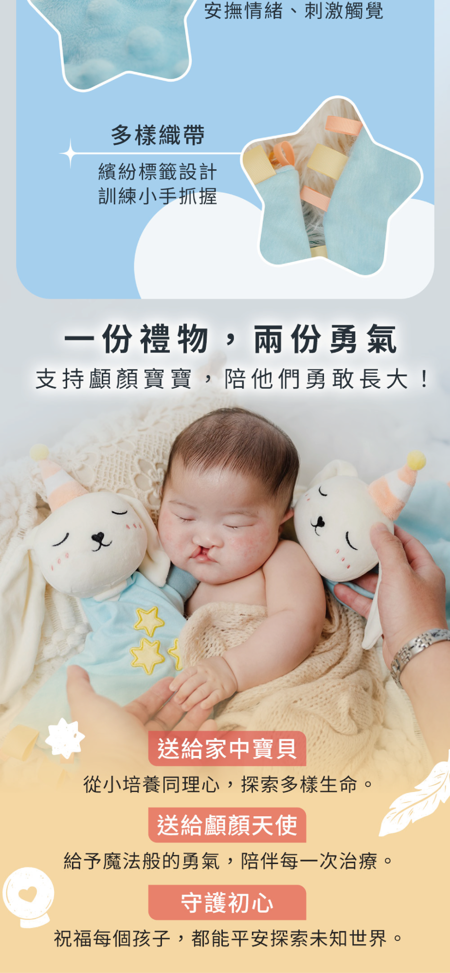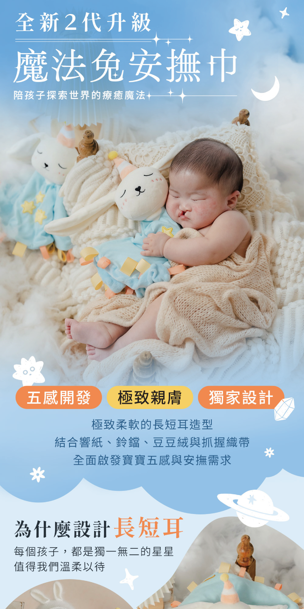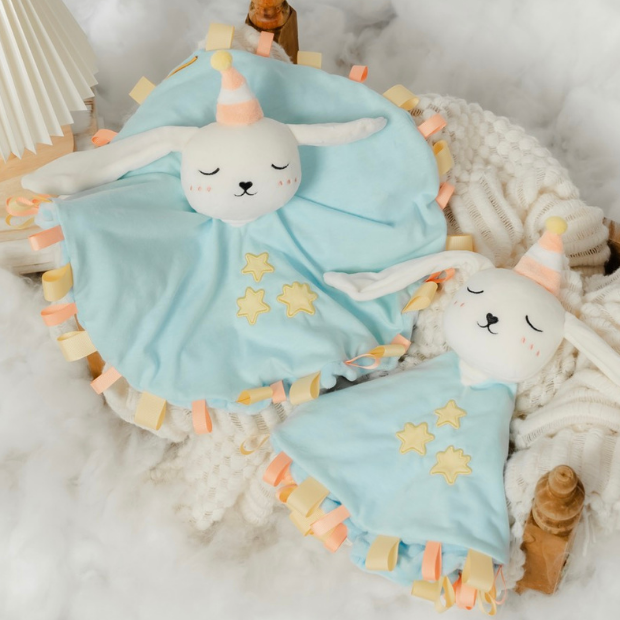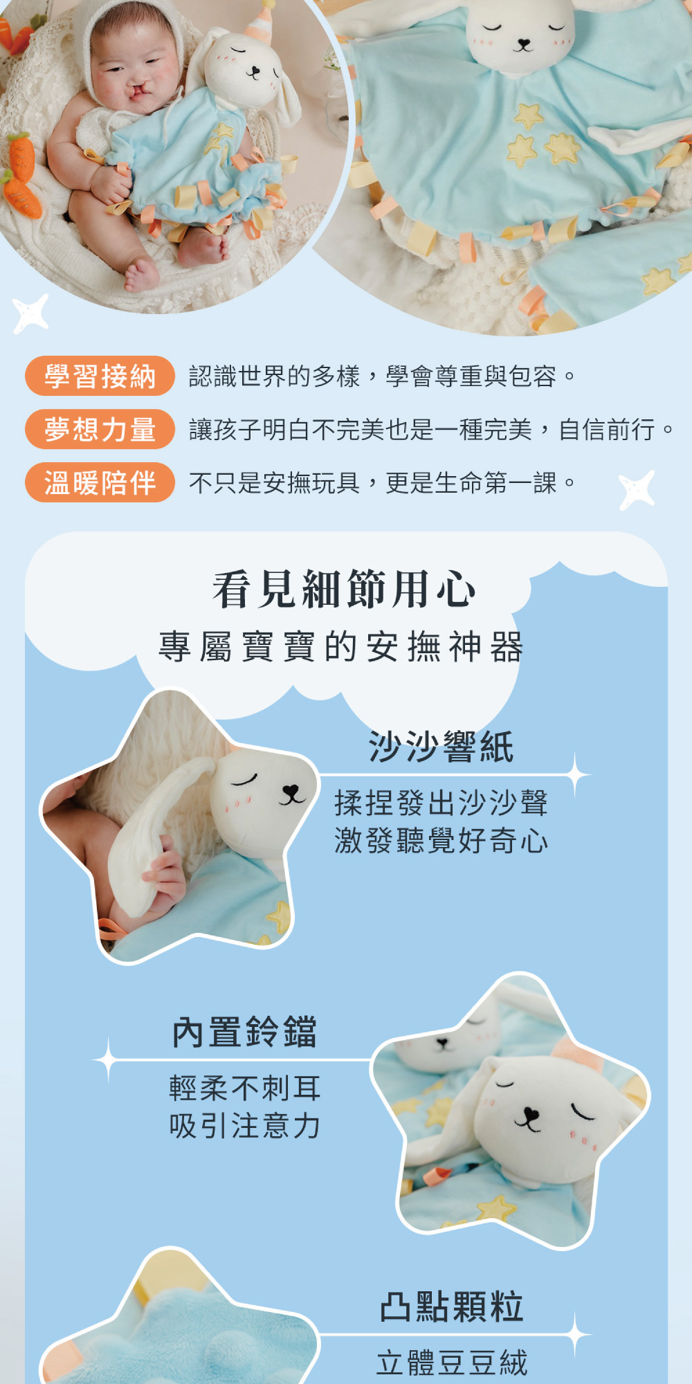 還記得魔法兔寶寶安撫巾嗎?第二代全新升級限量販售!極致柔軟的長短耳造型,結合響紙、鈴鐺、豆豆毯及抓握織帶,不只是安撫玩具,更是生命的第一課。讓孩子認識世界的多樣,學會尊重與包容。